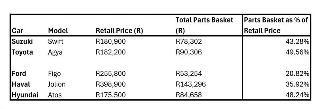 Before you buy a used car, ask about the cost of common parts like brake pads, oil filters, or headlights. This will give you a sense of whether the car will be expensive to maintain.Lower Parts Basket % = More Affordable to Own: A car like the Ford Figo have lower parts costs relative to their purchase price, making them more budget-friendly for long-term ownership.