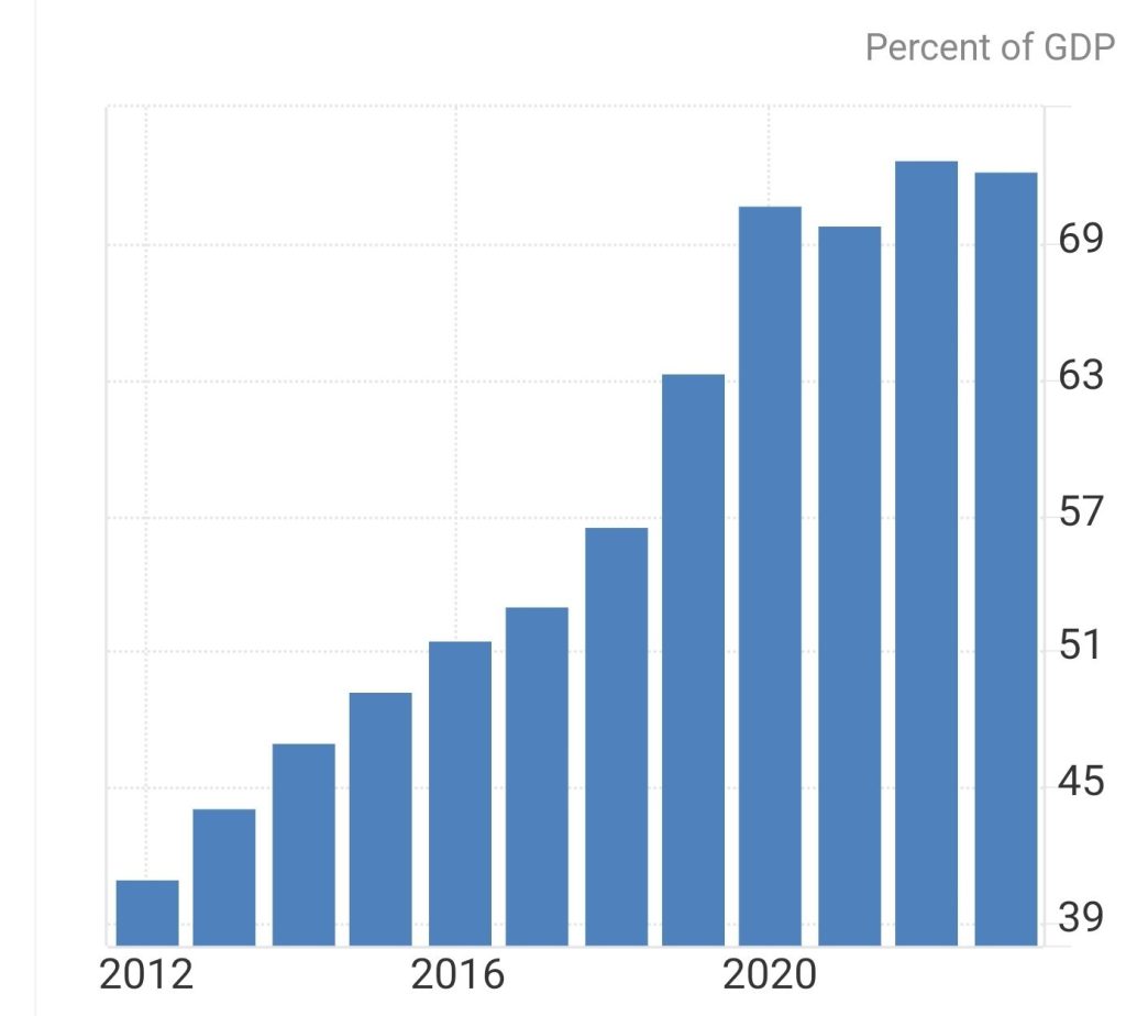 South Africa’s national debt has surged from R1.6 trillion (43% of GDP) in 2014 to R5.6 trillion (75% of GDP) in 2024, a 250% increase over a decade. Debt servicing now costs R356 billion annually, consuming over 20% of government revenue. Projections indicate the debt-to-GDP ratio will peak at 75.3% in 2025/26 before gradually declining.