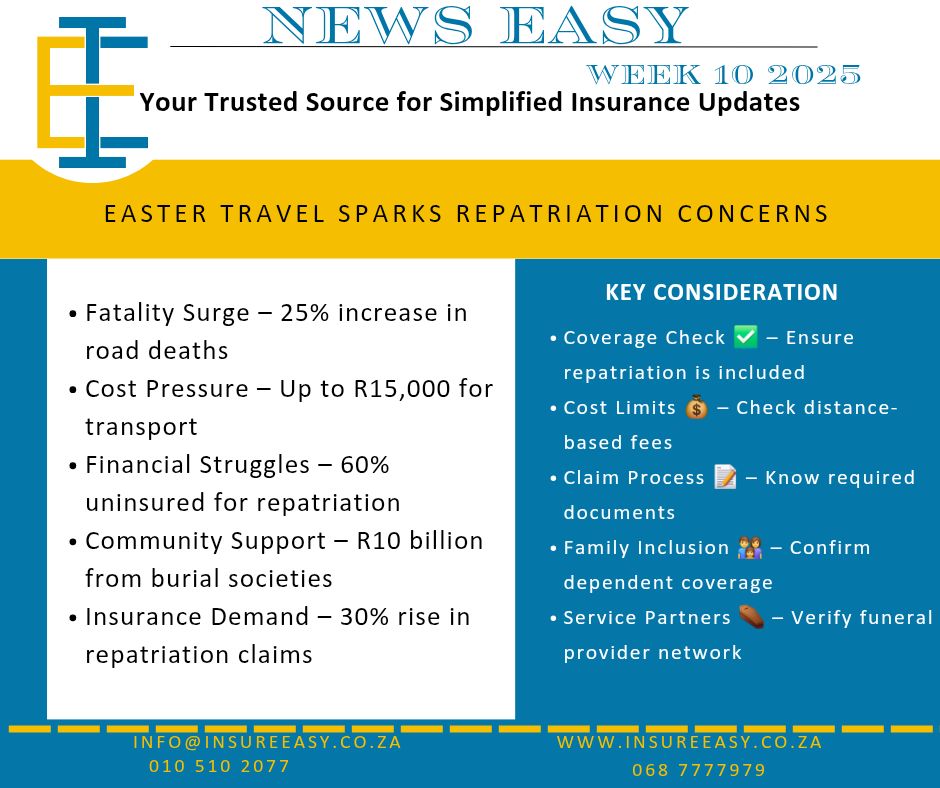 The Easter period sees a 25% increase in road fatalities, with thousands of South Africans traveling across provinces. Insurers report a 30% rise in repatriation claims during this season, emphasizing the need for policyholders to ensure their coverage is sufficient.