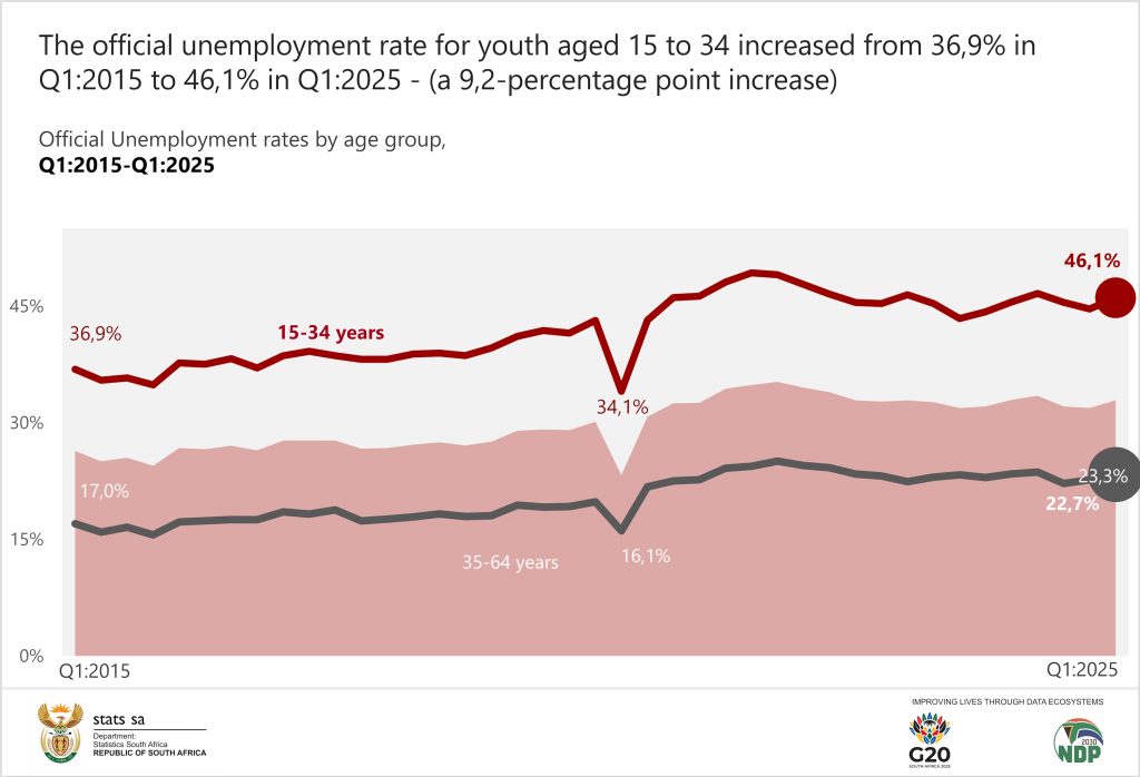 Youth unemployment (ages 15–34): has increased from 36.9% in 2015 to 46.1 in 2025