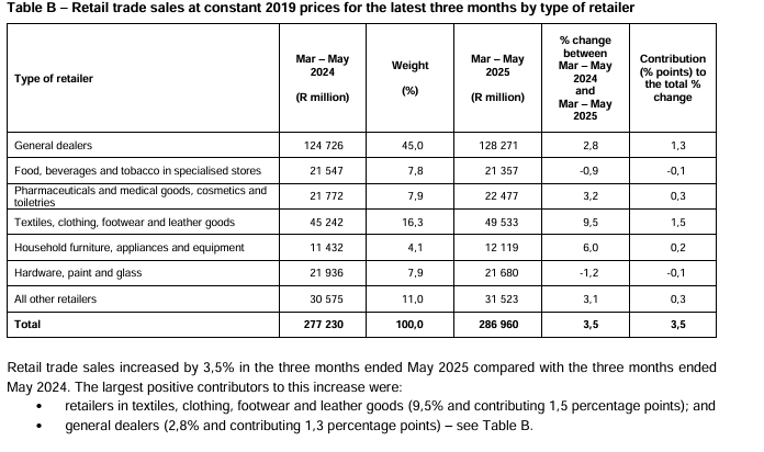 Pretoria, 16 July 2025 – South Africa’s retail trade sales rose by 5.1% in May 2025 compared to the same month last year, according to Statistics South Africa (Statistical Release P6242.1). This marks a notable improvement from earlier in the year and reflects growing activity in the economy — particularly among general dealers (like supermarkets) and clothing and footwear retailers.